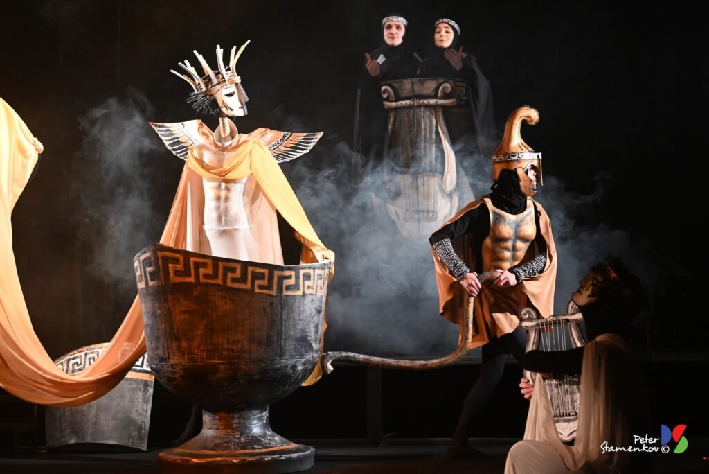 „Орфей” е спектакъл-паноптикум, съставен от монументални визуално-пластични картини, спектакъл-мозайка, съчетаващ театър на движението, игра с маски, кукли и театрални знаци. Митът за Орфей и Евридика пресъздава темата за раздялата и смъртта, за силата и слабостта на човешката душа. Постановката внушава, че макар да е божествено създание, човекът е само една искрица светлина сред необятното звездно небе.