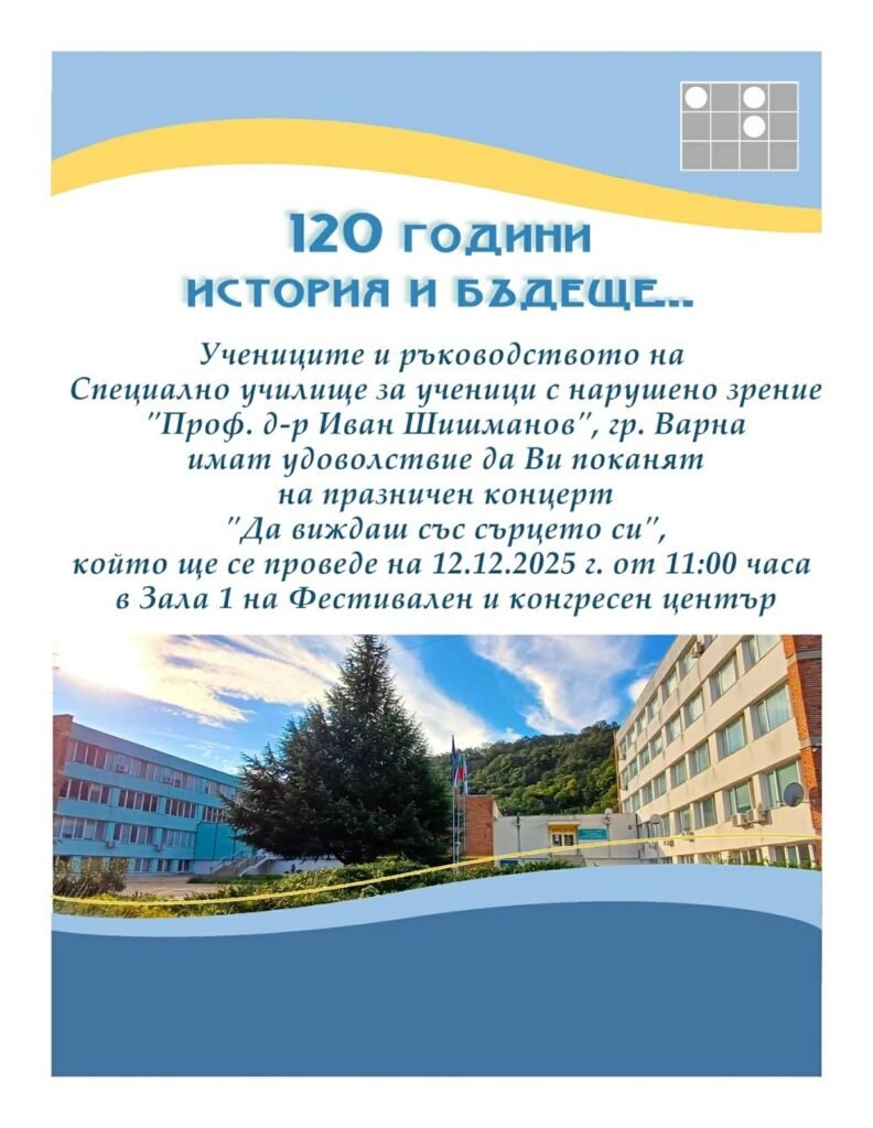 На 12 декември 2025 г. от 11:00 ч. в зала 1 на Фестивален и конгресен център – Варна ще се проведе тържествен концерт по повод 120-годишния юбилей на Специалното училище за ученици с нарушено зрение „Проф. д-р Иван Шишманов“. Събитието носи мотото „120 години – да виждаш със сърцето си“ и ще събере на една сцена настоящи и бивши възпитаници, както и интегрирани ученици с нарушено зрение от масови училища, подпомагани от ресурсни учители.