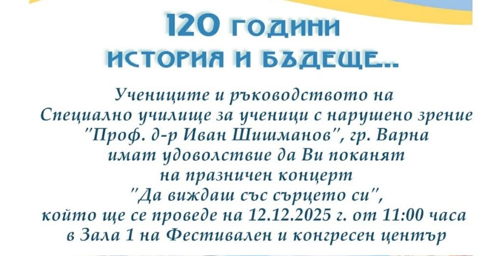 На 12 декември 2025 г. от 11:00 ч. в зала 1 на Фестивален и конгресен център – Варна ще се проведе тържествен концерт по повод 120-годишния юбилей на Специалното училище за ученици с нарушено зрение „Проф. д-р Иван Шишманов“. Събитието носи мотото „120 години – да виждаш със сърцето си“ и ще събере на една сцена настоящи и бивши възпитаници, както и интегрирани ученици с нарушено зрение от масови училища, подпомагани от ресурсни учители.