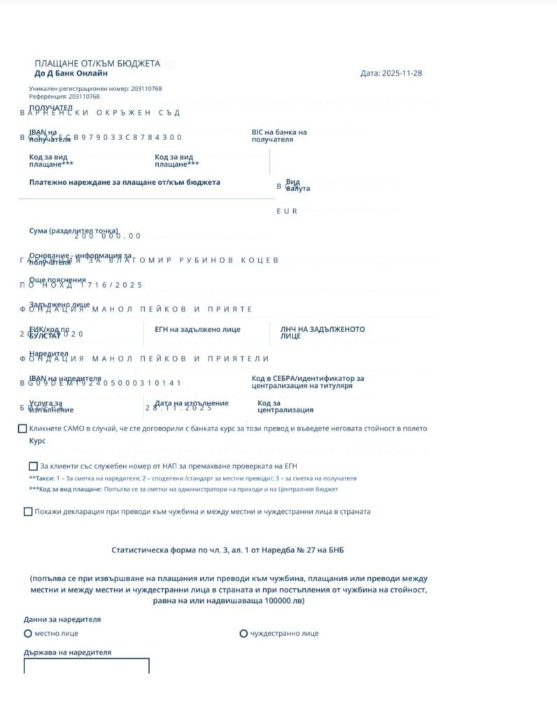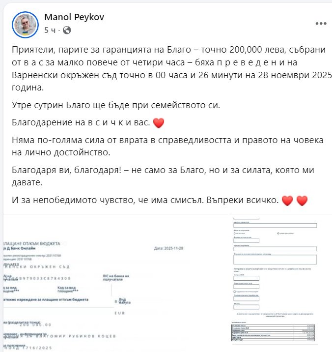 Само за няколко часа бяха събрани необходимите 200 000 лева за гаранцията на кмета на Варна Благомир Коцев. Това съобщи народният представител от ПП-ДБ Манол Пейков, който уточни, че средствата – дарени от хора от цялата страна – са преведени на Варненския окръжен съд точно в 00:26 ч. на 28 ноември 2025 г. По думите му Коцев ще може да се прибере при семейството си още утре сутрин.