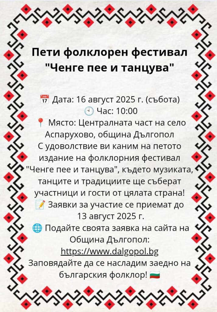 На 16 август 2025 г. (събота) централната част на село Аспарухово, община Дългопол, ще се превърне в сцена на българските традиции, музика и танци. От 10:00 ч. ще бъде даден старт на петото издание на фолклорния фестивал „Ченге пее и танцува“, който с всяка изминала година привлича все повече участници и гости от цялата страна. […]