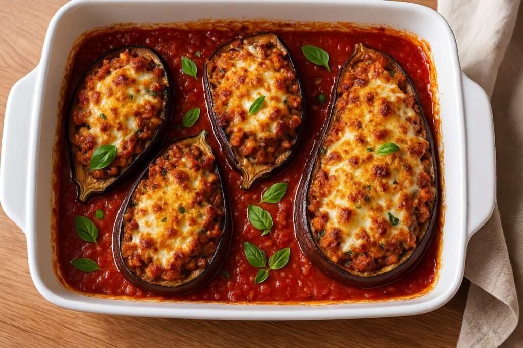 Пълнени патладжани „Пармиджана“ – Лесна рецепта с доматен сос, кашкавал и златиста коричка