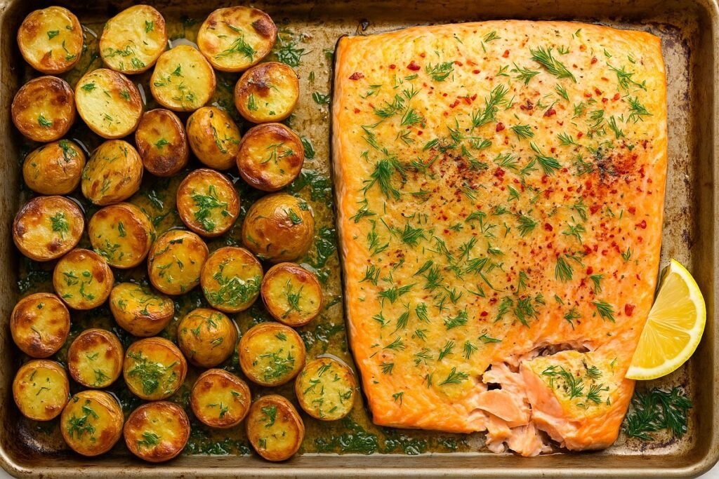 Време за приготвяне: 45 минути • Порции: 4 • Калории: ~480 kcal на порция Ароматна и сочна сьомга, изпечена заедно с бебешки картофи върху една тава – бързо, лесно и с минимално почистване след това! Крехкото рибно филе се съчетава перфектно с чесново–маслен сос и много копър, а печените картофи придобиват златиста коричка и невероятен […]