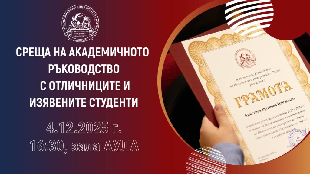 Икономически университет – Варна ще проведе традиционната си среща с отличници и изявени студенти на 4 декември 2025 г. от 16:30 ч. в зала АУЛА. Събитието, на което са поканени представители на медиите, е посветено на студентите с отлични академични резултати и активна извънучебна дейност, допринасяща за авторитета на висшето училище. Традицията е част от […]