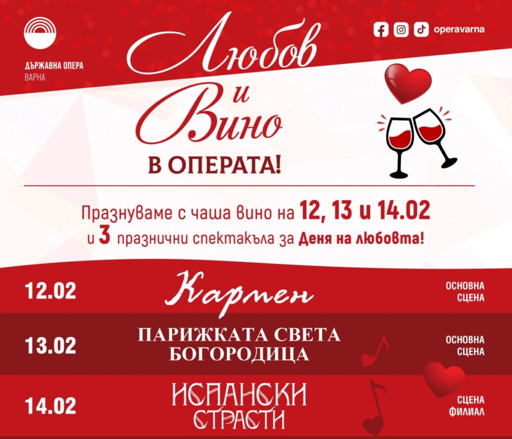 В три поредни дни Варненската опера ще празнува Свети Валентин с хитови спектакли за любов. На 12 февруари публиката ще се срещне с „Кармен“ – една от най-емблематичните творби в световното оперно изкуство, където страстта на героите намира брилянтен музикален израз. В главната роля на Кармен ще влезе румънското мецосопрано Флорентина Соаре, а оркестъра ще […]