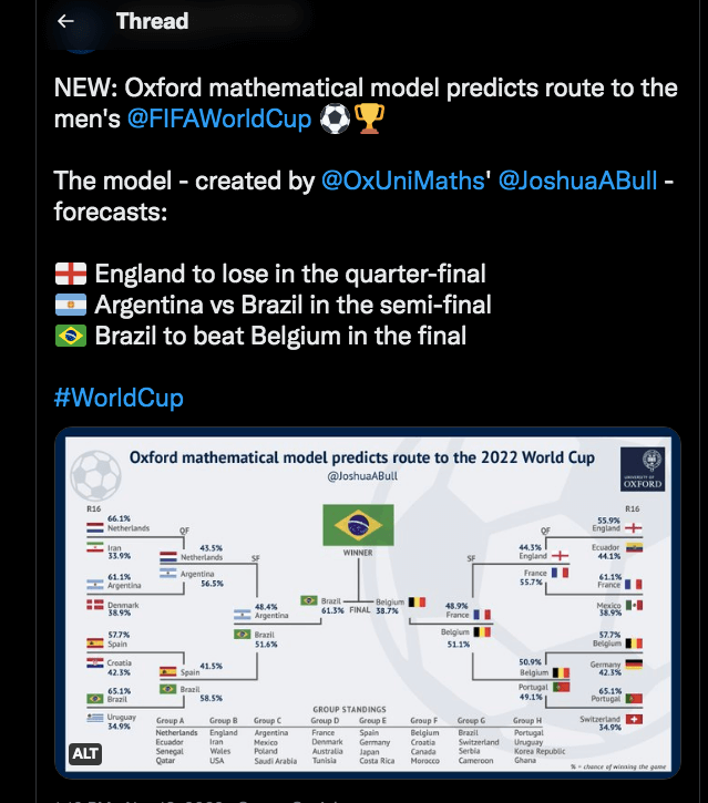 Според прогнозата Бразилия ще вземе шестата си световна титла след победа срещу Белгия на финала. Преди това тимът на Тите ще има доста тежък път до финала, като последователно ще отстрани Уругвай на осминафинала, Испания на 1/4-финал и Аржентина на полуфинала. Белгия пък на свой ред ще се справи с Германия, Португалия и Франция, допълват от Gong.