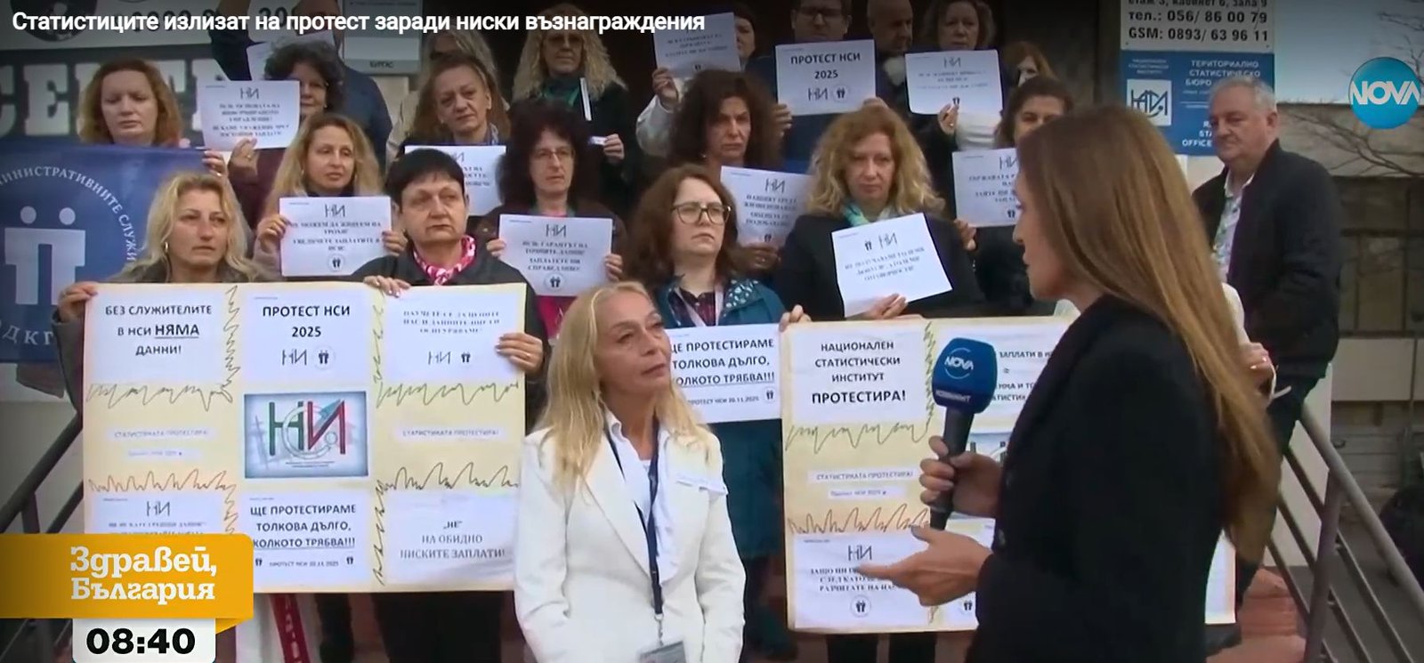 От ранните часове на деня служителите на НСИ в Бургас протестират пред сградата на институцията, като това е вторият такъв протест от миналата година насам. По тяхна информация в проекта за бюджета е предвидено увеличение от 5%, докато основното им искане е за ръст на работните заплати с 20 на сто. Възнагражденията в сектора варират в зависимост от опита и конкретните отговорности. Заплатата на главен специалист по трудово правоотношение в момента е около 1550 лева, или приблизително 850 евро бруто, а за младши специалист – 1633 лева, което се равнява на около 835 евро.