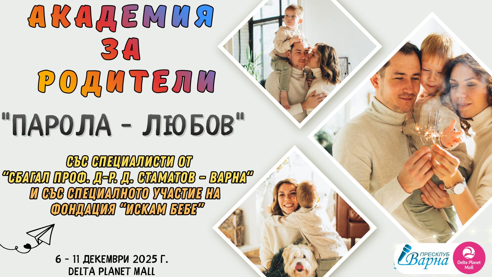 Академия за родители “Парола – Любов” с беседи на водещи специалисти от “СБАГАЛ Проф. д-р. Д. Стаматов – Варна“ ви очаква в дните на изложението. Ще имате прекрасна възможност да се консултирате на място с хората, които посрещат новия живот и споделят най-щастливите моменти за всяко семейство.