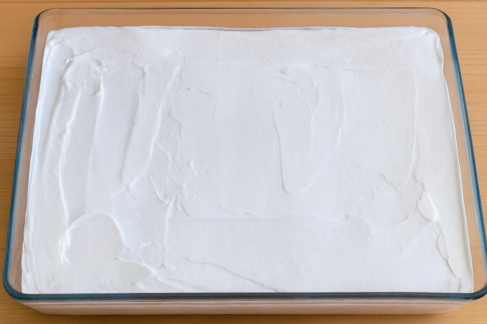 Разбийте крем шантито със студеното мляко до плътен крем. Разпределете върху напълно изстиналия блат и приберете в хладилник.