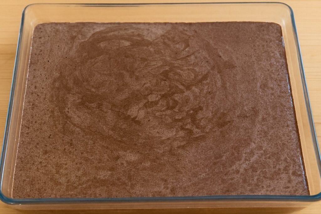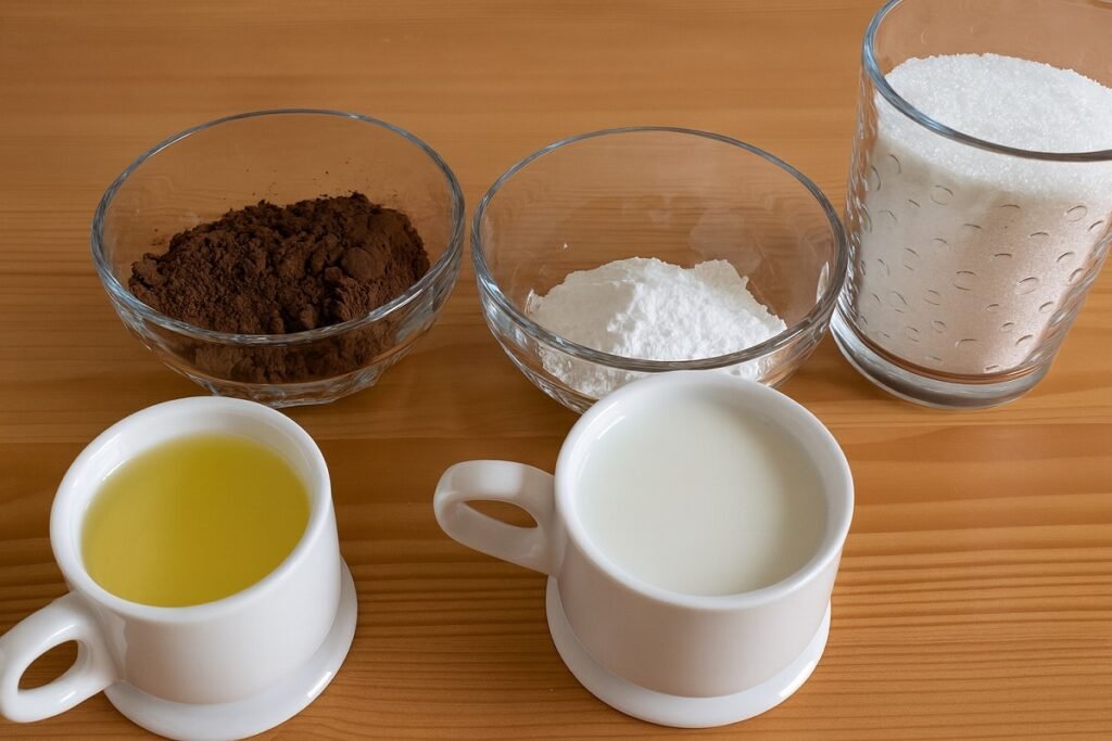 Разбийте яйцата със захарта до пухкав и светъл крем. Добавете млякото и олиото, след това какаото. Накрая прибавете пресятото брашно и бакпулвера и разбъркайте до хомогенна смес.