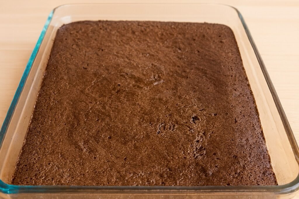 Оставете блата леко да се охлади. Надупчете го с клечка и равномерно залейте със студеното мляко.