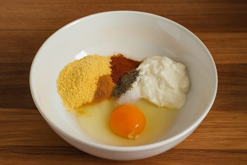 В купа смесете киселото мляко, царевичното брашно, яйцето, солта, червения пипер, черния пипер и куркумата. Разбъркайте до гладка консистенция.