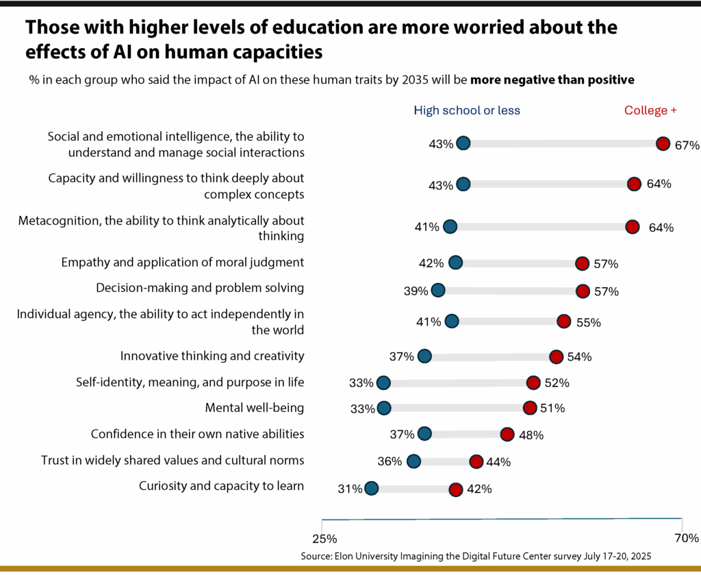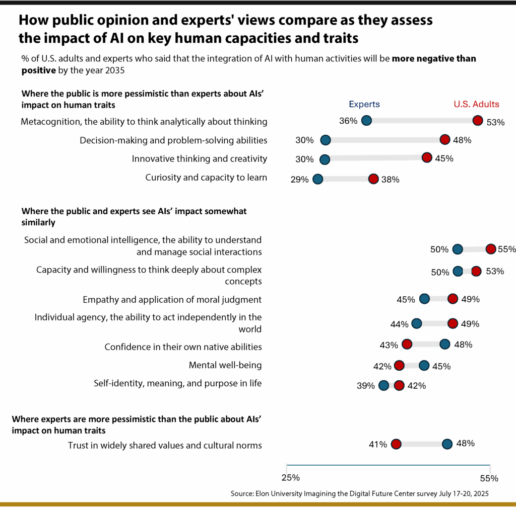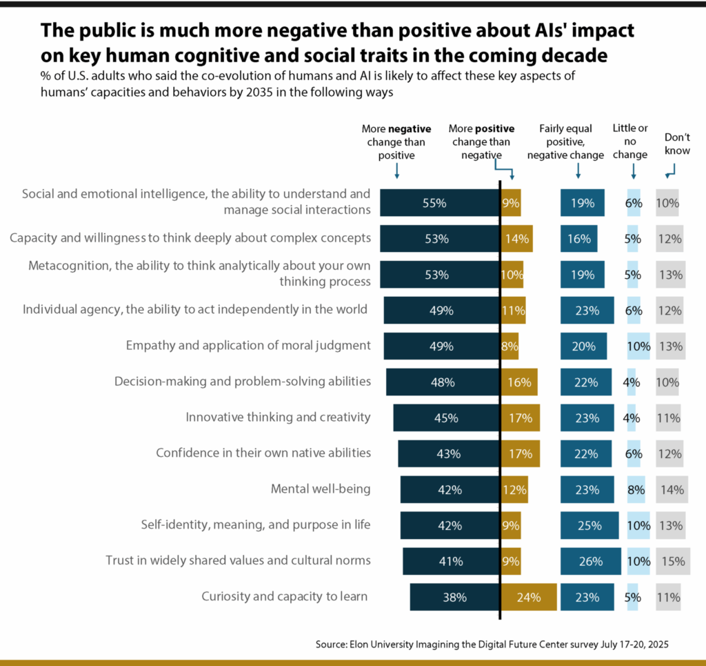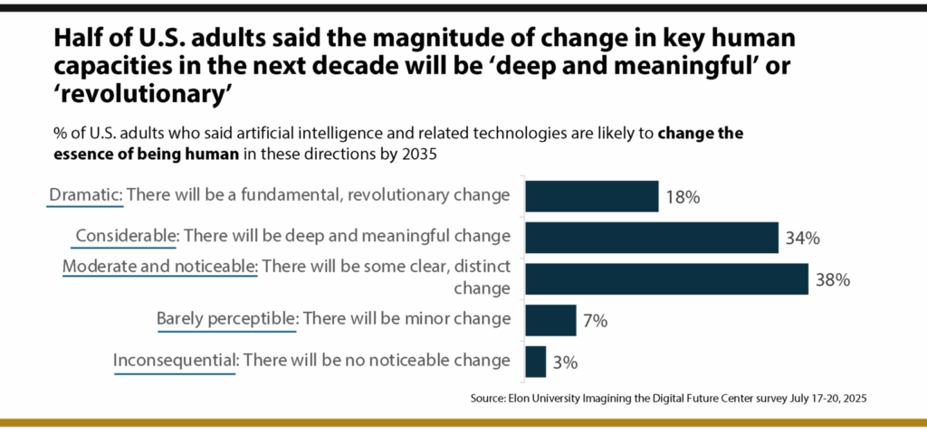 Проучване, проведено през юли 2025 г. от Центъра Imagining the Digital Future към Elon University, показва, че повечето американци очакват настъпващото десетилетие, белязано от развитието на AI, да донесе значителни и предимно отрицателни промени в човешките способности.