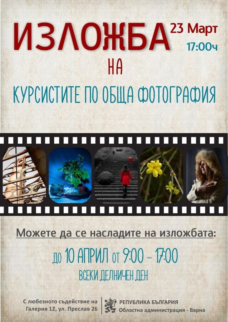 Арт Галерия 12 във Варна кани ценителите на фотографията на изложба, посветена на участниците в курса по обща фотография към „Кино-фотоклуб“ – Варна. Експозицията представя творческото развитие на новото поколение автори, завършили обучението си под ръководството на Теодора Петкова – лектор и дългогодишен член на клуба.