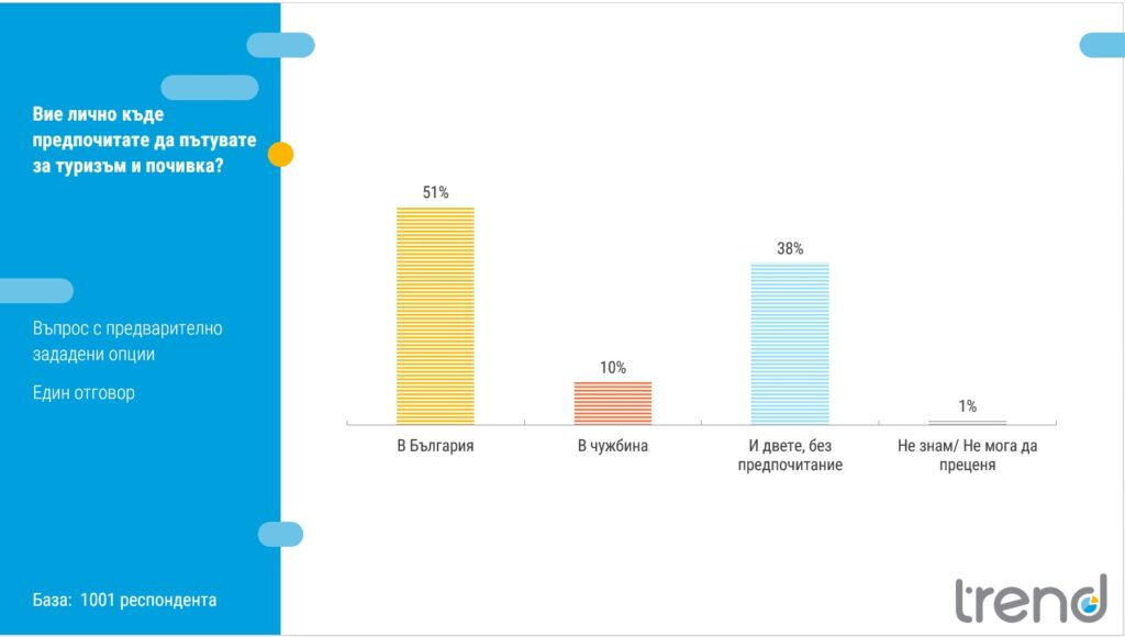 По повод Световния ден на туризма Министерството на туризма представи съвместно със социологическа агенция „Тренд“ национално представително проучване за нагласите на българите към туризма и почивките в страната, реализирано по поръчка на Министерството на туризма. Данните показват, че България остава предпочитаната дестинация за нашите сънародници – 51% от анкетираните заявяват, че избират почивка у нас, докато едва 10% насочват интереса си към чужбина.