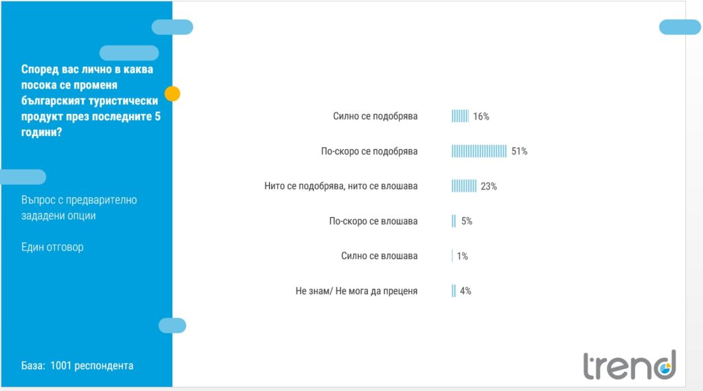 Морските дестинации продължават да са най-популярни, но расте и интересът към планинския, СПА и културно-историческия туризъм. Сред сферите, в които туристите очакват подобрения, са инфраструктурата, качеството на обслужването и чистотата на обектите и околната среда.