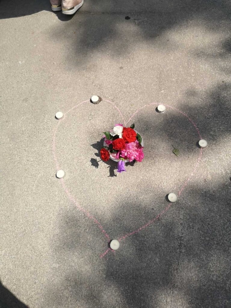 Участниците издигнаха плакати с надписи „Безхаберието на общината убива“ и „Пазете децата“, поставиха инсталация с цветя и свещи, както и раздаваха листовки и балони на преминаващите семейства.