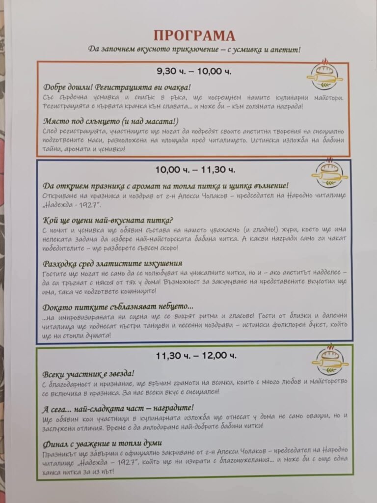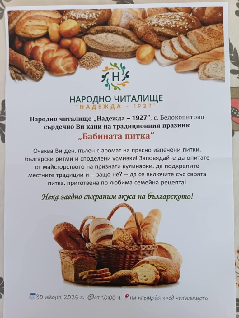 Народно читалище „Надежда – 1927“ организира традиционния кулинарен празник „Бабината питка“. Събитието започва в 9:30 ч. на площада пред читалището и включва изложба на домашно приготвени питки, дегустации, награди за най-вкусните творения и богата фолклорна програма. Посетителите ще могат да опитат топли печива, да подкрепят местните традиции и да се насладят на истинска атмосфера на българско гостоприемство.