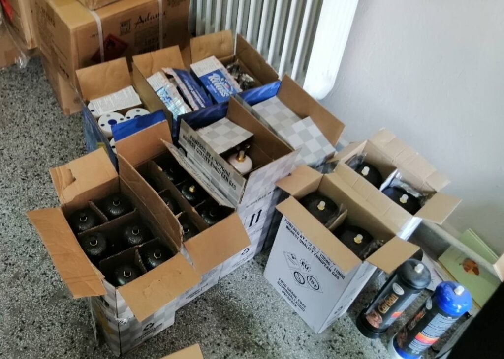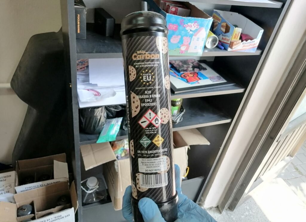 На място са открити и иззети 150 флакона по 1 литър с диазотен оксид, 576 флакона по 8,2 г с вероятно идентично съдържание, както и 44 машинки тип „шприц“, използвани за вдишване на газа.