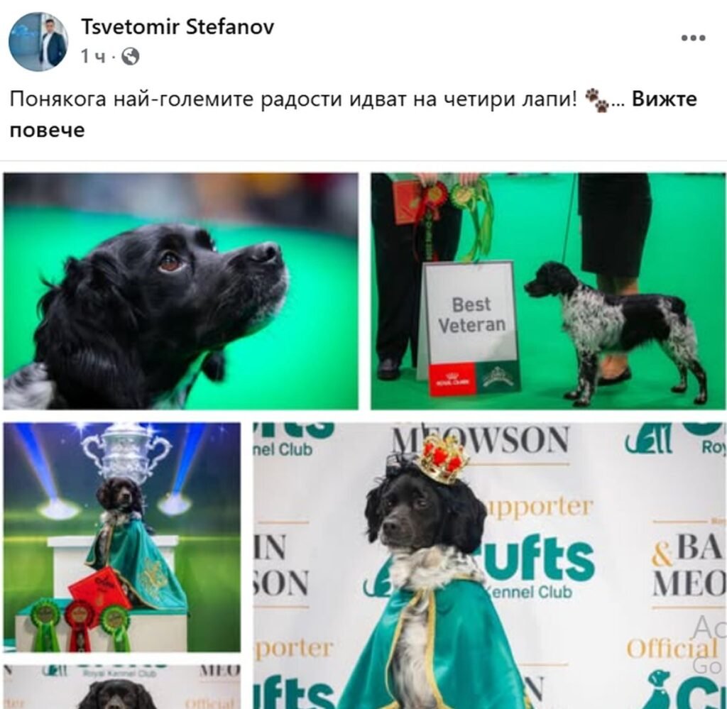 “Понякога най-големите радости идват на четири лапи! С огромна гордост споделям, че кучето ни спечели титлата Best Veteran Winner на едно от най-престижните киноложки състезания в света, проведено в Бирмингам, Обединеното кралство.