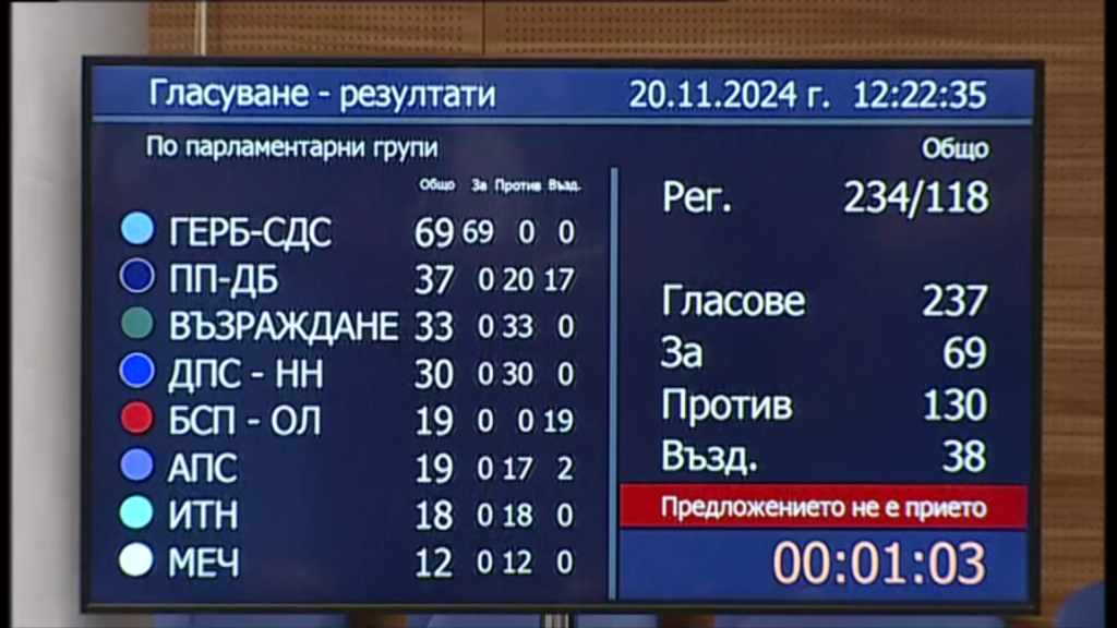 Предложението от „Възраждане“ – Петър Петров беше отхвърлено. От общо 238 народни представители 47 бяха „за“, 69 – против, а 122 се въздържаха.
