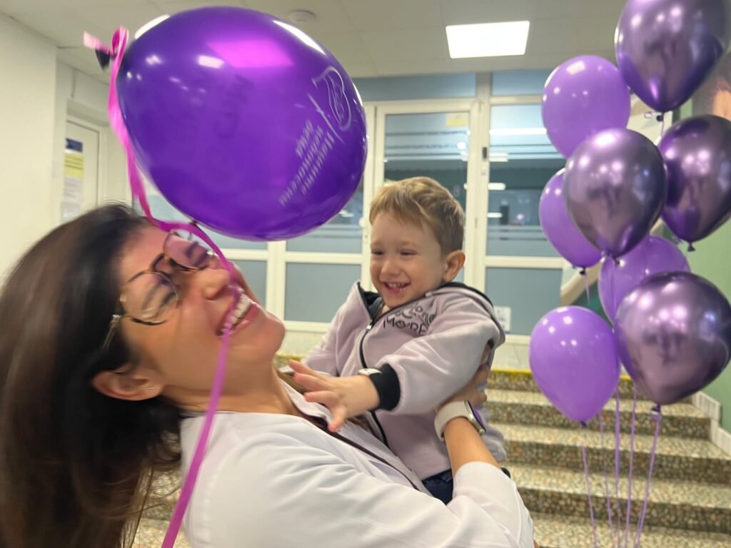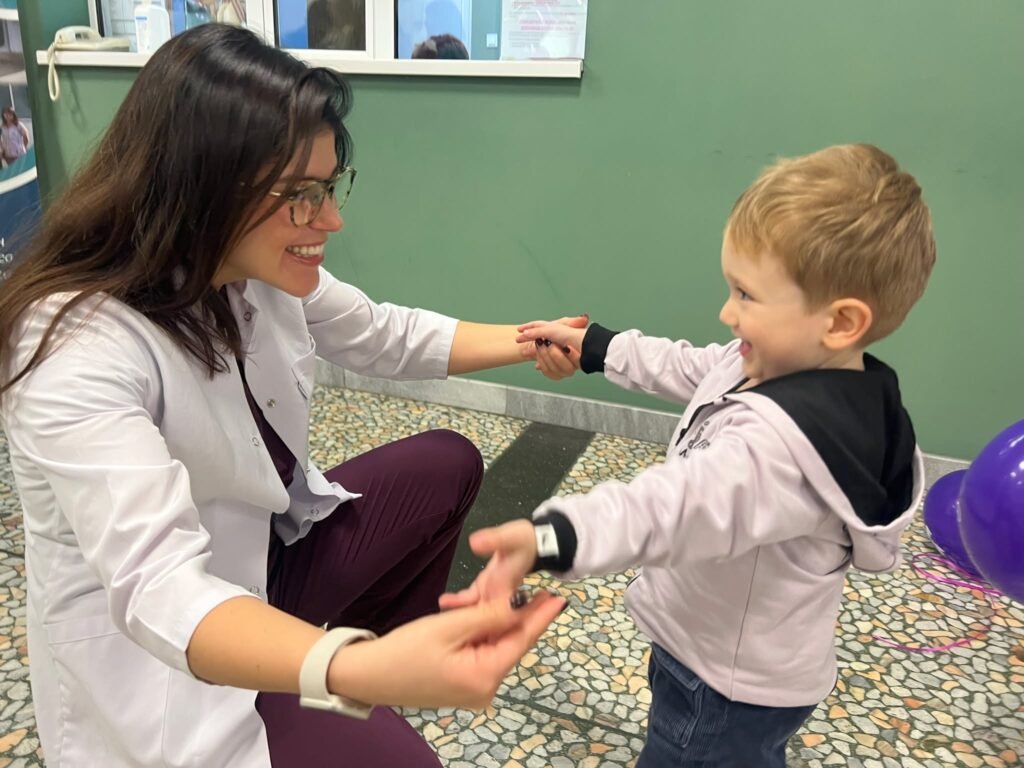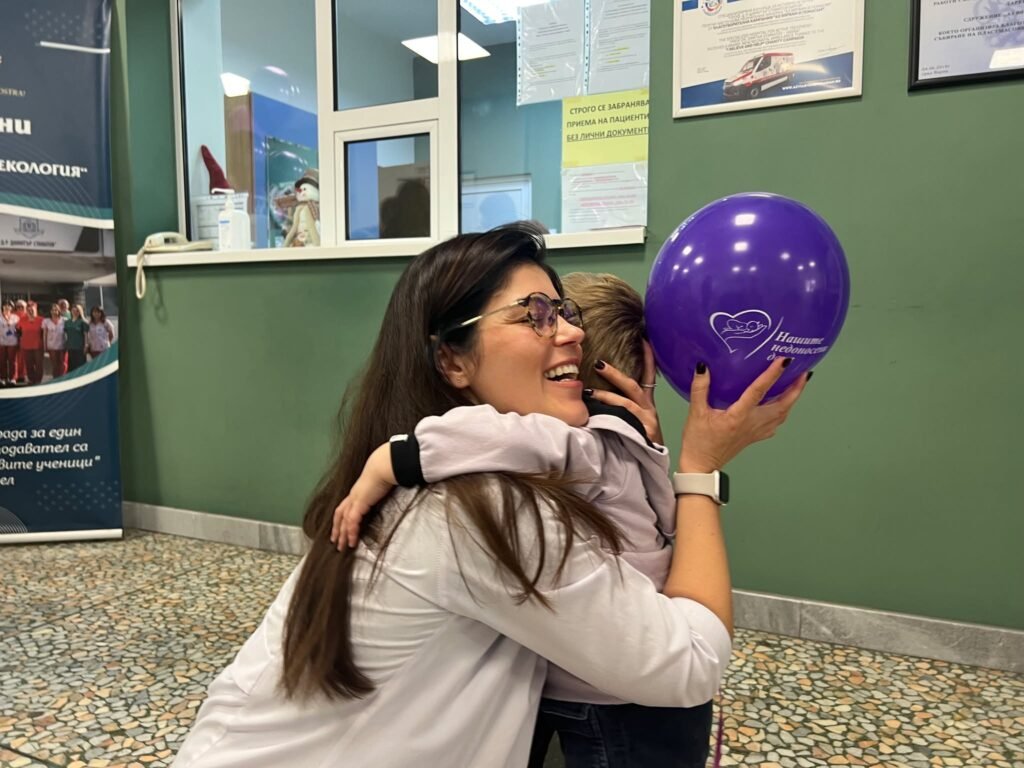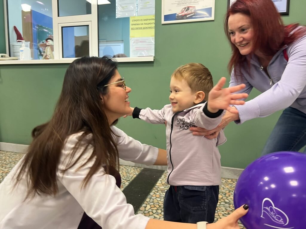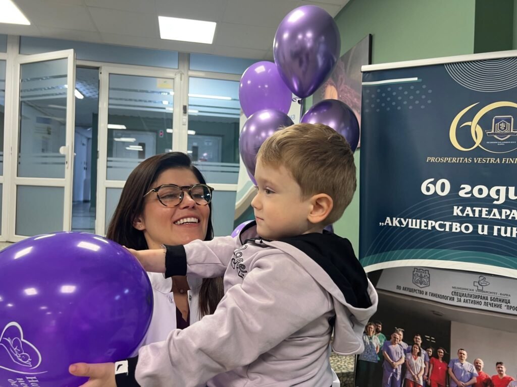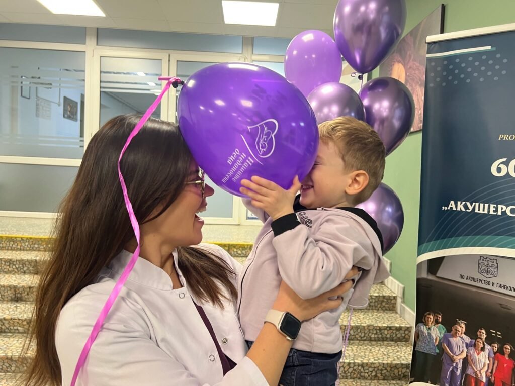 Медицински специалист и майка с малко момче позират усмихнати по повод събитие за недоносените деца в АГ болница Варна, с лилави балони и информационни табла на заден план.