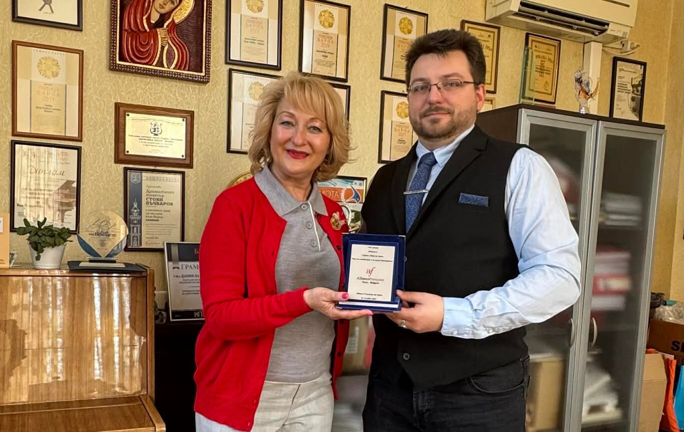 Председателят на „Алианс Франсез“ – Варна Любомир Калудов връчи на Даниела Димова, директор на Театрално-музикален продуцентски център Варна, Наградата на Алианса за 2025 година.
