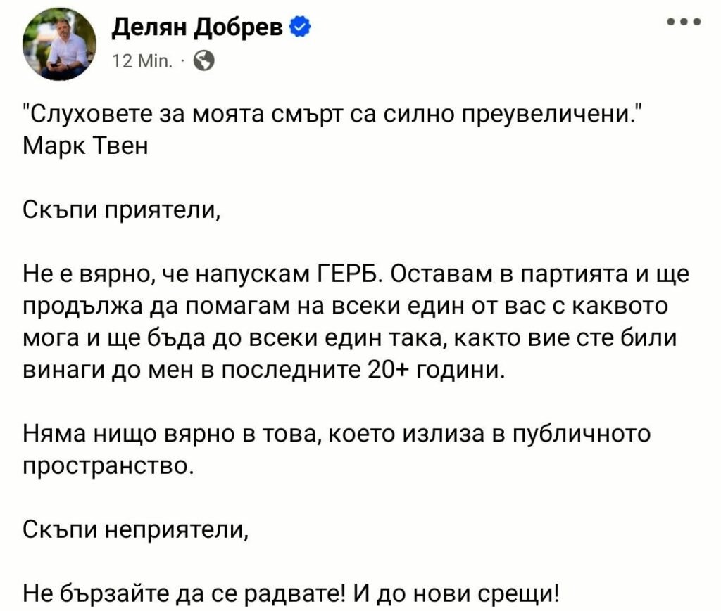 Делян Добрев обяви, че не е вярно, че напуска ГЕРБ. Той направи това с публикация в официалния му профил във Facebook.