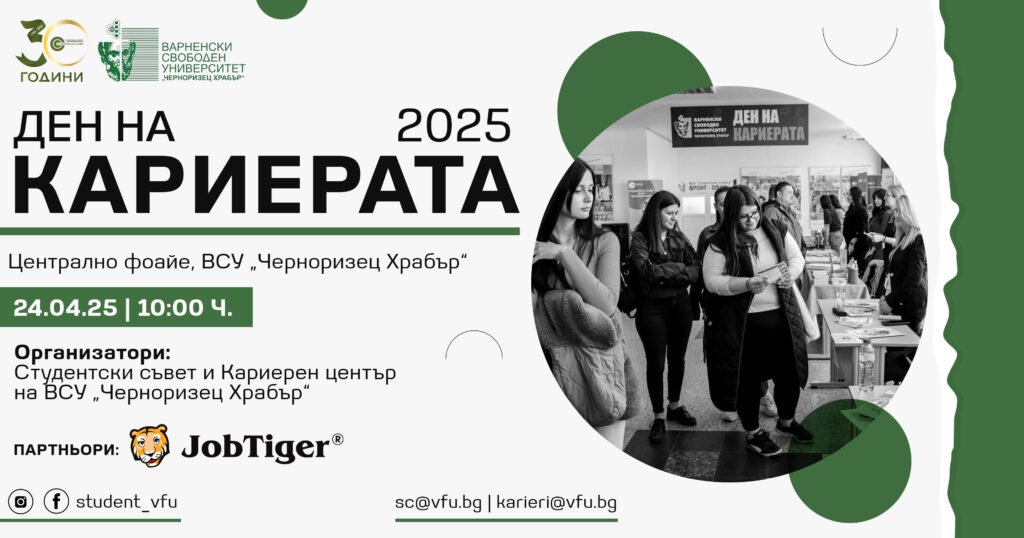 „Ден на кариерата“ ще се проведе във ВСУ „Черноризец Храбър“ на 24 април 2025 г. от 10:00 ч. в централното фоайе на университета. Събитието е организирано от Студентския съвет и Кариерния център. То има за цел да създаде мост между образованието и бизнеса, като насърчи професионалното развитие на студентите и улесни прехода им от академичната среда към пазара на труда. Участниците ще могат да се срещнат директно с представители на различни институции и водещи компании от сфери като финанси, строителство, недвижими имоти, търговия, публичен сектор и услуги.