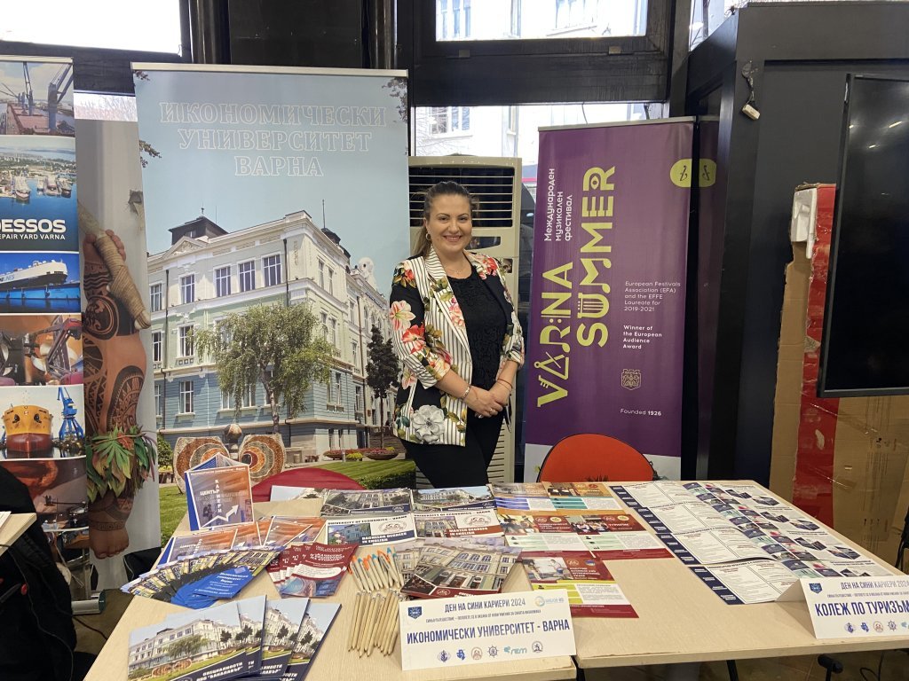 Представителите на Център “Кариери, предприемачество и маркетинг” към Икономически университет – Варна – Гергана Вълкова – експерт, професионално/кариерно ориентиране и Деница Герчева – експерт “Реклама” и Колеж по туризъм – Варна – доц. д-р Генка Рафаилова и студенти от колежа представиха възможностите за обучение в ИУ – Варна в различните образователно-квалификационни степени, както и възможностите за развитие, които университета предлага на своите студенти.