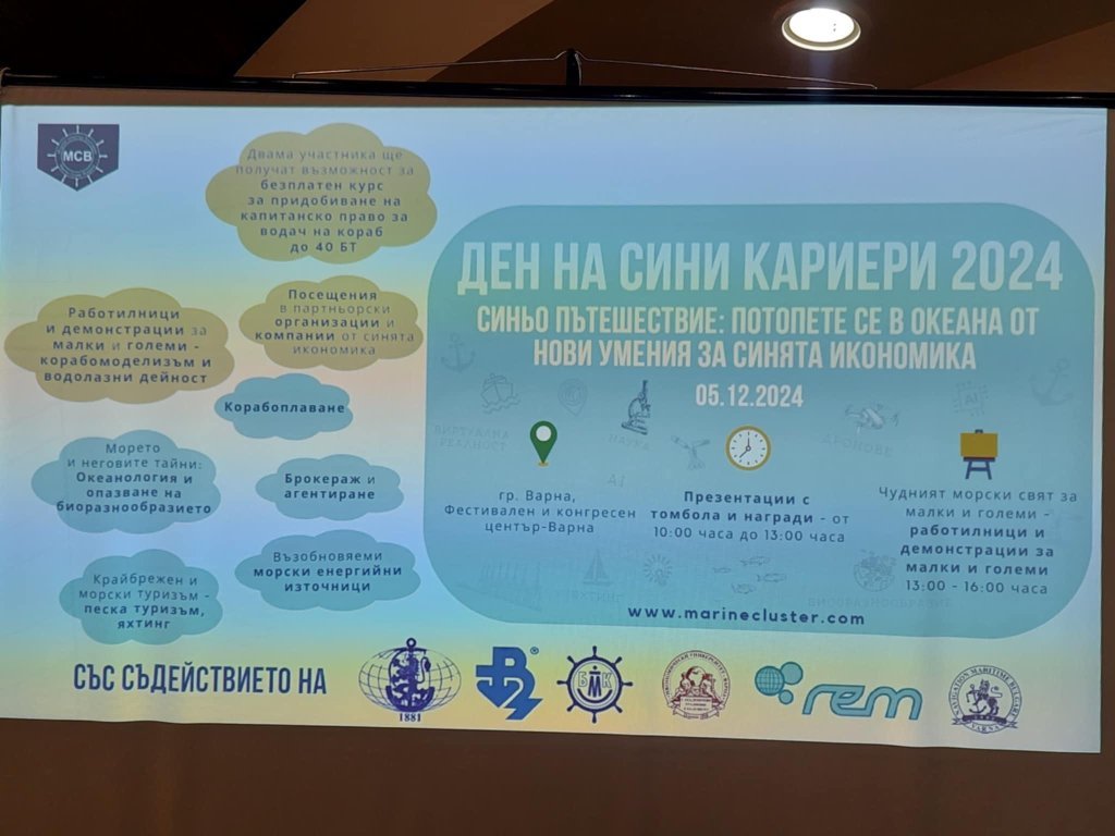 Морски клъстър България, със съдействието и подкрепата на Българска морска камара, Висше военноморско училище „Никола Йонков Вапцаров“, Технически университет – Варна и Икономически университет – Варна продължиха традицията за организиране на „Ден на сини кариери“, с цел информиране и привличане на младите хора към морските професии.