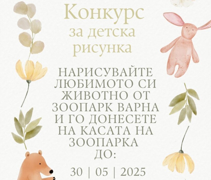Зоопарк Варна кани всички малки любители на животните да се включат в конкурс за детска рисунка на тема: „Моето любимо животно от зоопарка“. Инициативата цели да провокира въображението на децата и да ги насърчи да изразят любовта си към животните чрез изкуство.