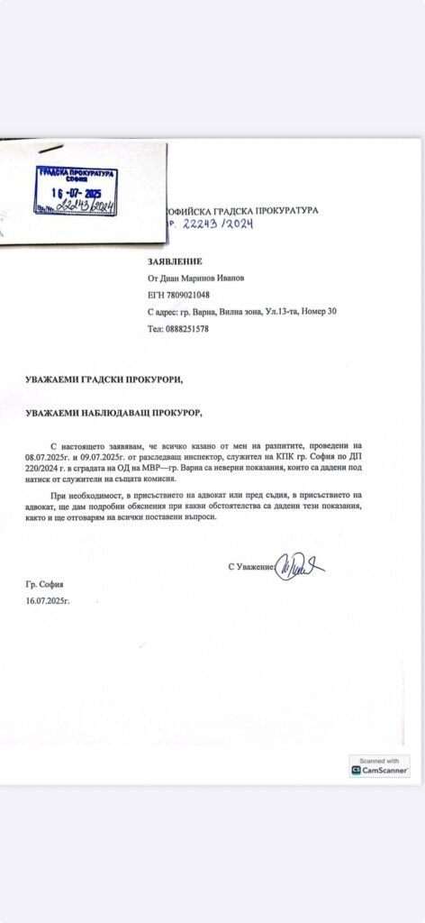В писменото си заявление, входирано под номер 22243/2024, Иванов заявява, че разпитите са се провели в сградата на Областната дирекция на МВР – Варна във връзка с досъдебно производство № 220/2024 г.