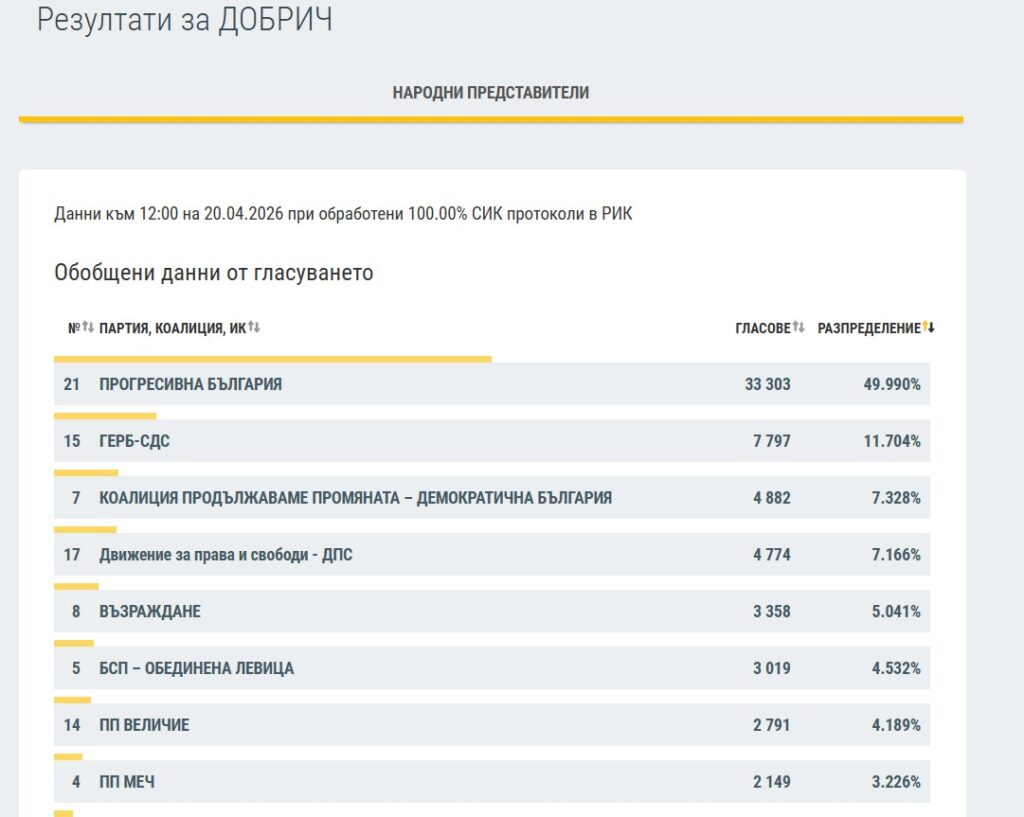 Категорична победа за Прогресивна България в област Добрич показват окончателните резултати от парламентарния вот на 19 април 2026 г. При 100% обработени протоколи към 12:00 часа формацията събира 33 303 гласа, което се равнява на 49.99% от вота.