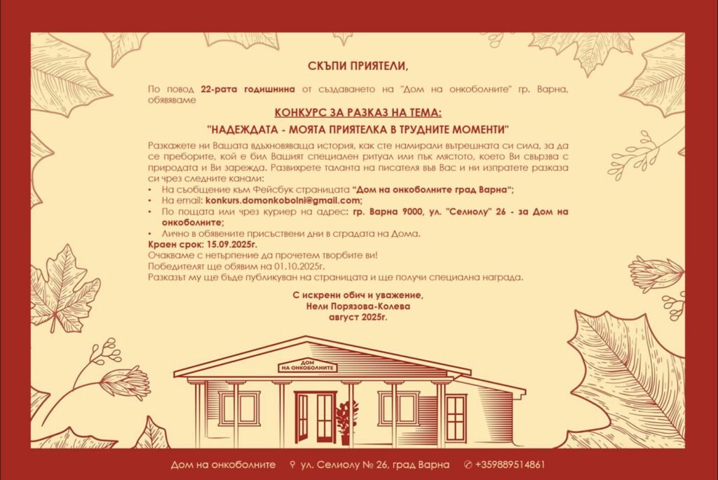 “Дом на онкоболните” Варна” отбелязва 22 години от създаването си с конкурс за разказ на тема “Надеждата – моята приятелка в трудните моменти”