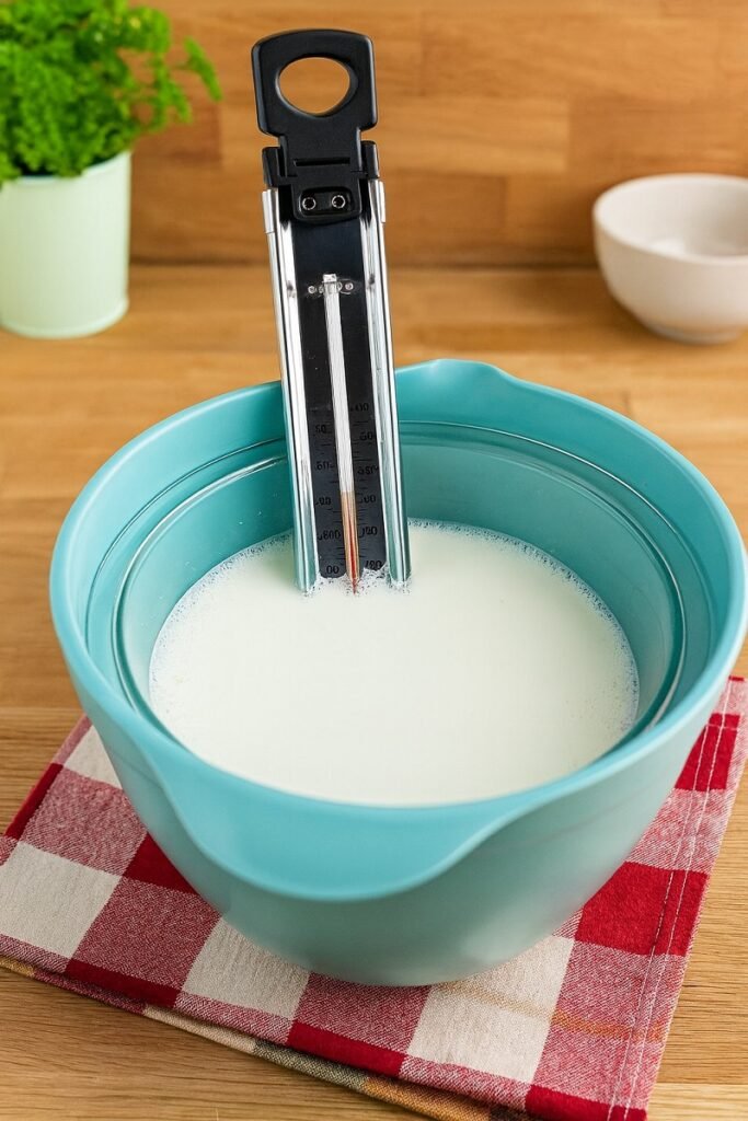 - Прехвърлете горещото мляко в стъклена купа и оставете да се охлади до 41–45°C (105–110°F).