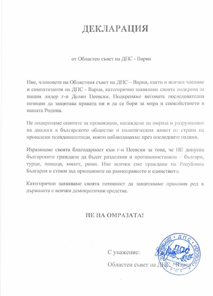 ДПС – Варна публикува официална декларация в подкрепа на Делян Пеевски, подчертавайки последователната му позиция за защита на гражданските права и за запазване на обществения мир.