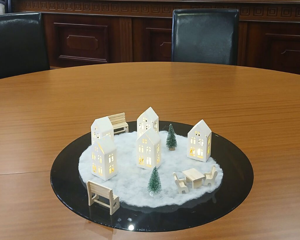 Заседателната маса бе преобразена от сръчните ръце на дамите от екипа на детското заведение в коледно градче – с малки и големи сгради със заснежени покриви и светещи прозорчета, пейки и беседки, централен площад, изпълнен с коледари, часовникова кула, висока сграда и мост – препратка към сградата на Общината и Аспарухов мост.