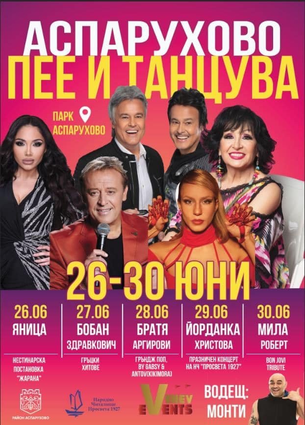 Традицията повелява да стартираме лятото с много свежи изненади и чакани забавления! Заповядайте на “Аспарухово Пее и Танцува” от 26 до 30 юни в парк “Аспарухово”, за да се насладите на вкусна храна, студени напитки, цветни атракциони и страхотни развлечения за малки и големи!
