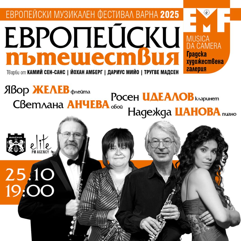 На 25 октомври от 19:00 ч. в Градската художествена галерия на Варна ценителите на камерната музика ще имат възможността да чуят премиерно за морския град проекта „Европейски пътешествия“. Концертът, част от програмата на Европейския музикален фестивал Варна 2025, представя един рядко звучащ и изключително колоритен в своята звукова палитра клавирен квартет – флейта, обой, кларинет и пиано, съобщи за СайтЪТ Нина Локмаджиева.