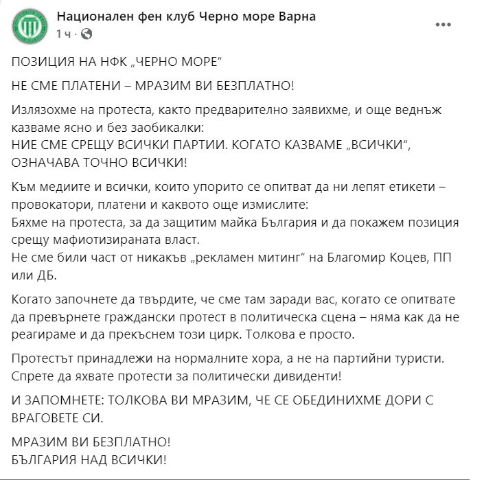 Националният фен клуб на „Черно море“ публикува остра позиция след участието си във вчерашния протест във Варна. В изявлението си организацията категорично отхвърля твърдения, че е била част от политически сценарий или че подкрепя конкретни партии.
