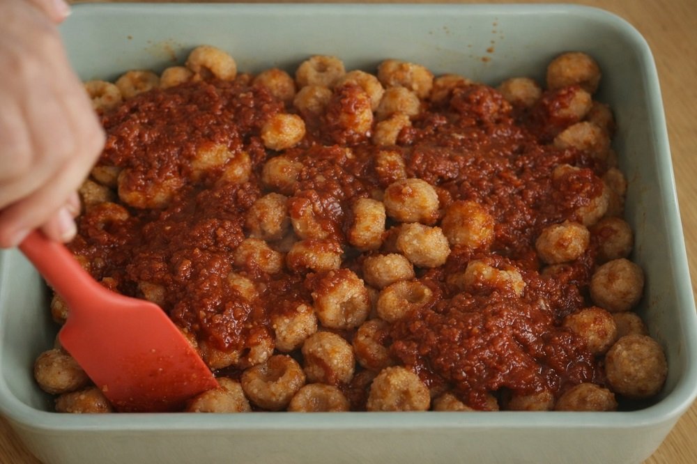 - Залейте кюфтетата със соса и разбъркайте внимателно.