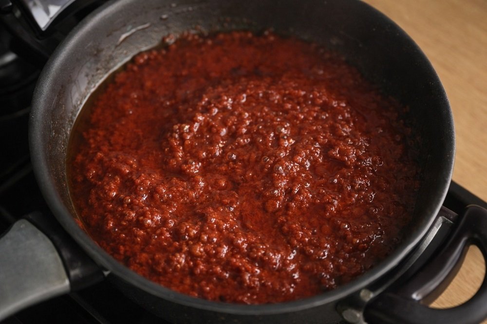 - За соса: загрейте зехтина, добавете пиперената паста и доматите.