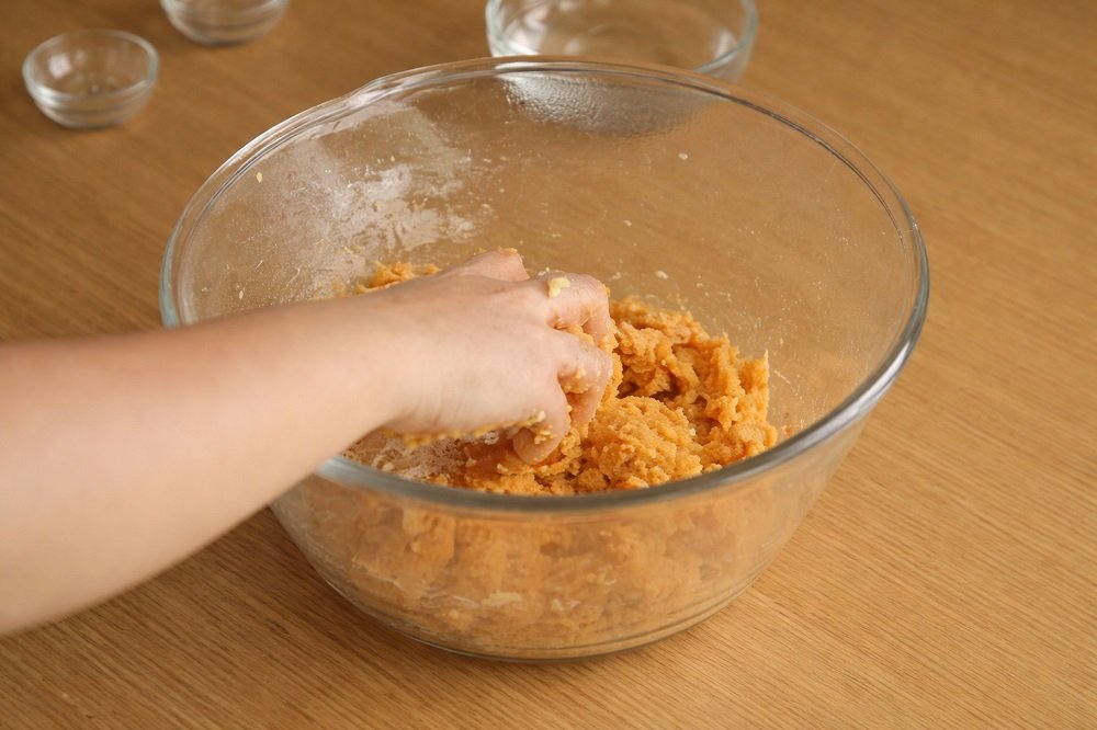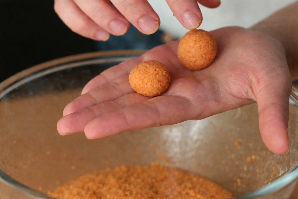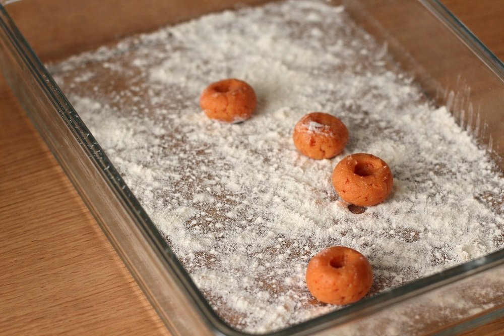 - С леко навлажнени ръце оформяйте топчета малко по-големи от лешник. С пръст направете вдлъбнатина в средата.
