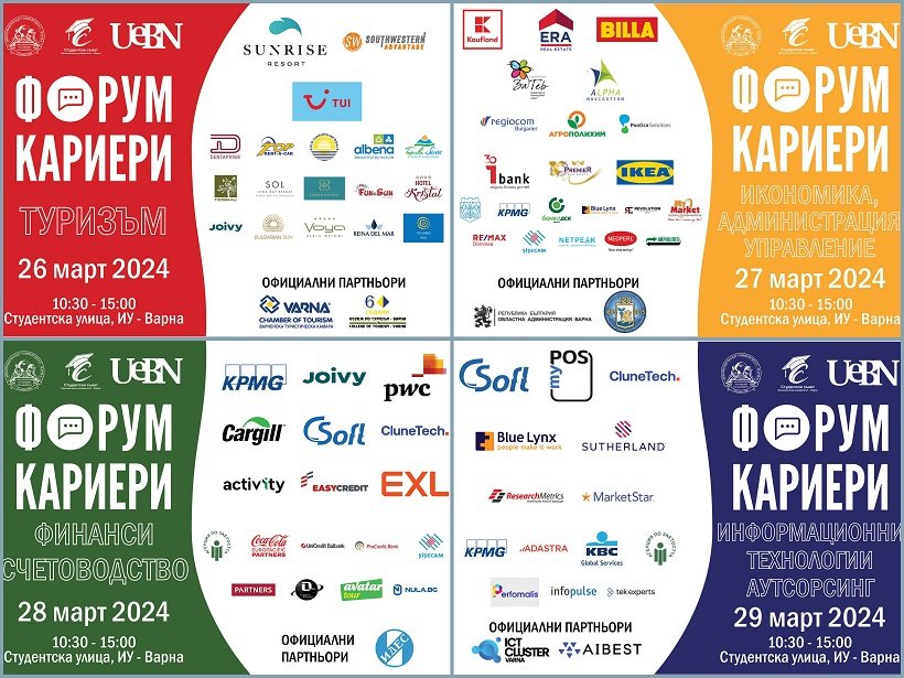 Традиционният форум „Кариери“ в Икономически университет – Варна ще се проведе присъствено от 26 до 29 март 2024 г. Той ще бъде открит официално на 26 март от 10.00 ч. в зала 1.