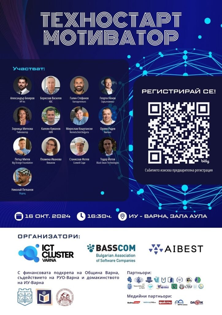 ИКТ Клъстер – Варна, в партньорство с БАСКОМ (Българска асоциация на софтуерните компании) и AIBEST (Association for Innovation, Business Excellence, Services and Technology) организира за трета поредна година събитието “ТЕХНОСТАРТ – Мотиватор”. На 16 октомври (сряда) от 16:30 ч. в зала Аула на Икономически университет – Варна ще се съберат ученици, студенти и преподаватели с представители на водещи ИТ компании от страната и региона.
