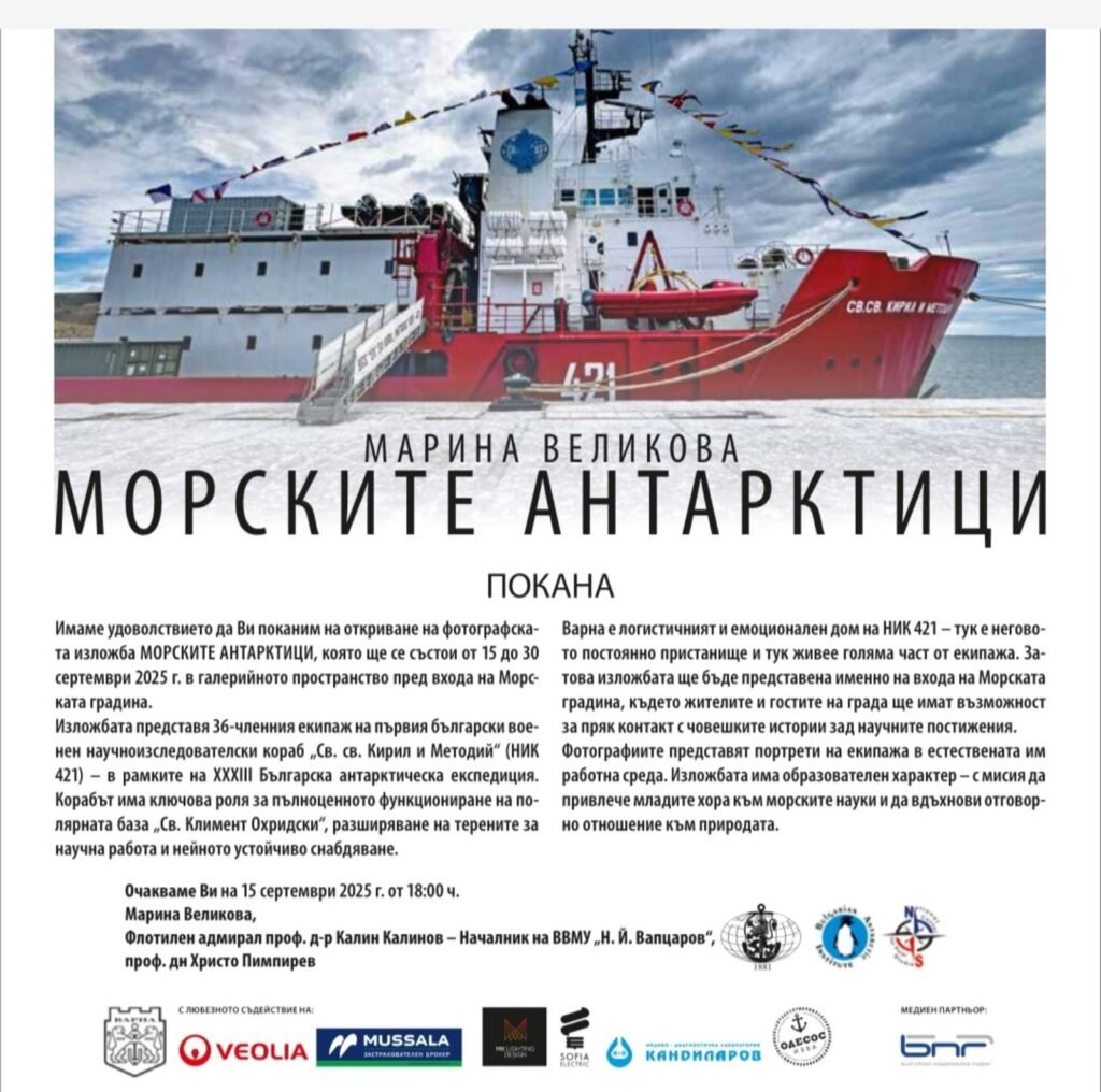На 15 септември 2025 г. от 18:00 ч. на входа на Морската градина във Варна ще бъде открита откритата фотографска изложба „Морските антарктици“ на Марина Великова.