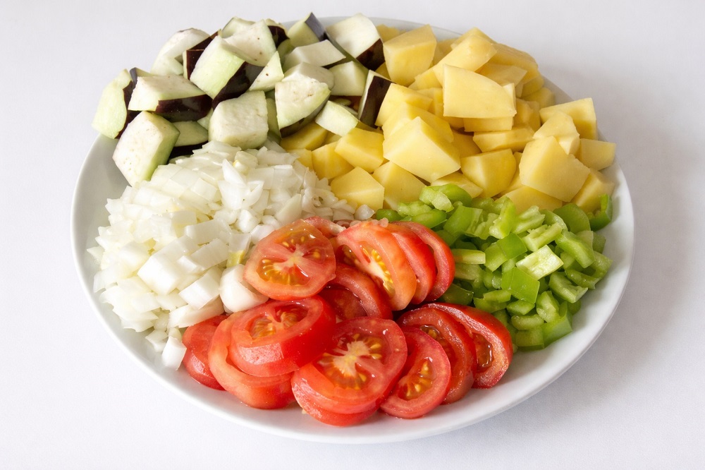 - Измийте всички продукти и ги нарежете на едри кубчета.