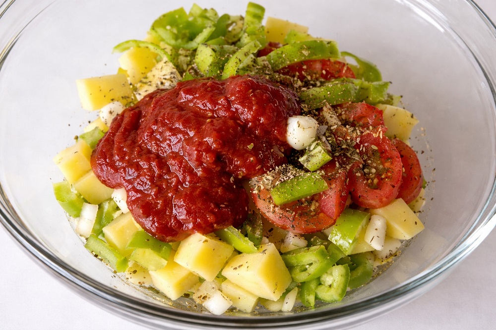 - В отделна купа смесете доматеното пюре, солта, ригана, ментата и зехтина.