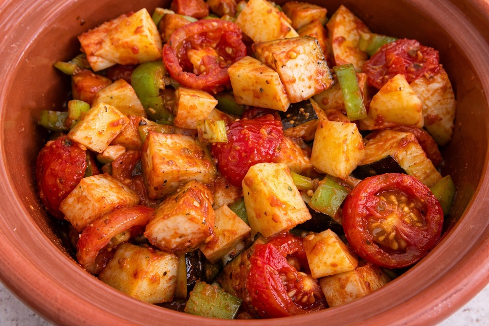 Количеството вода трябва да покрива зеленчуците съвсем леко. Прекалено много течност ще направи гювеча воднист вместо плътен и ароматен.